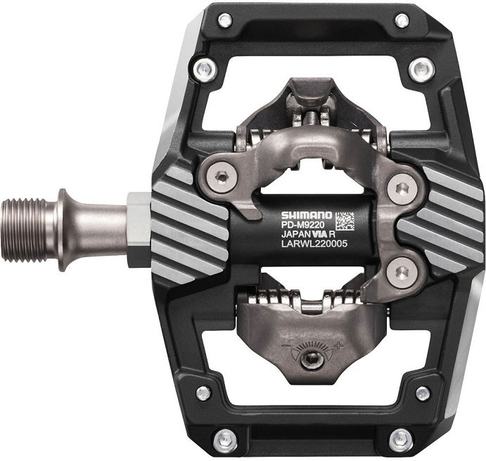 Двустранните SPD педали XTR PD-M9220 осигуряват непоколебимо сцепление и стабилност за интензивно enduro, all mountain и trail каране. Повдигнатата им платформа и по-широката контактна площ между обувките и педалите подпомагат стабилното педалиране за по-добър контрол над велосипеда. Четири пина от всяка страна подобряват грипа, осигурявайки допълнително сцепление и стабилност върху неравен или непредсказуем терен.