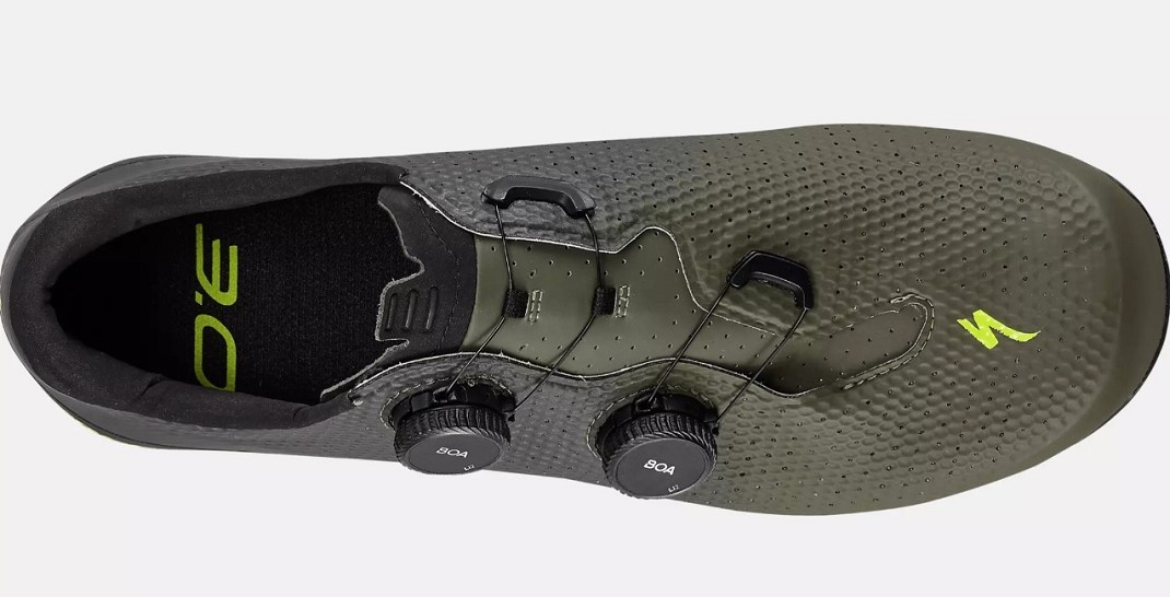 Подметката от еднопосочен карбон осигурява отлична твърдост при ниско тегло, което позволява максимално ефективен трансфер на мощност към педалите. В същото време гумените елементи в зоната на петата и пръстите дават допълнително сцепление при ходене. Системата BOA® Fit System с два Li2 регулатора позволява прецизна микро-регулация в движение и равномерно разпределение на натиска върху стъпалото, което подобрява комфорта и стабилността при дълги карания. Горната част е безшевна и комбинира TPU и мрежести панели, осигуряващи отлична вентилация и сигурно фиксиране на крака.