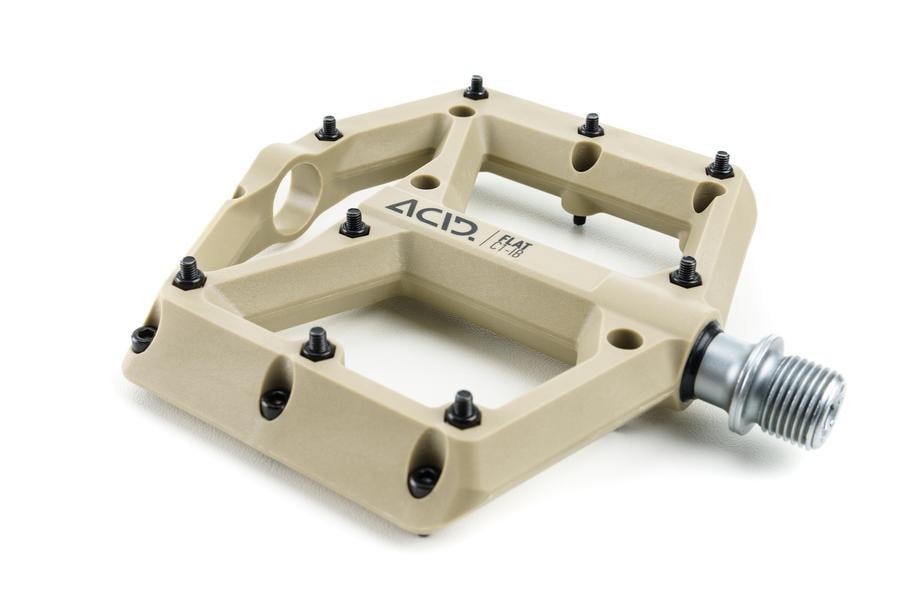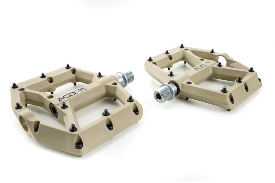 Високопроизводителни платформени педали за планинско колоездене ACID Pedals FLAT C1-IB със сменяеми пинове и скосени ръбове за по-добър клирънс в завои.