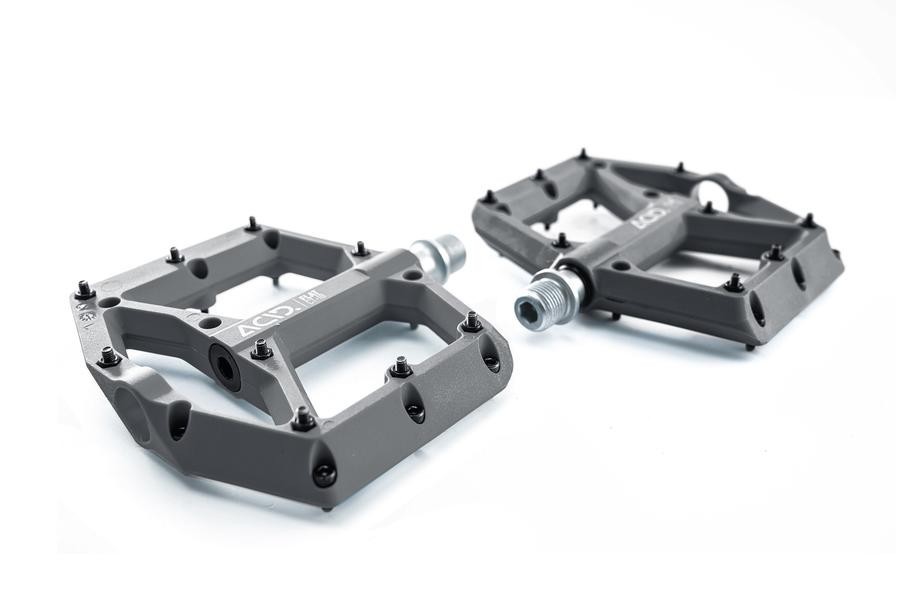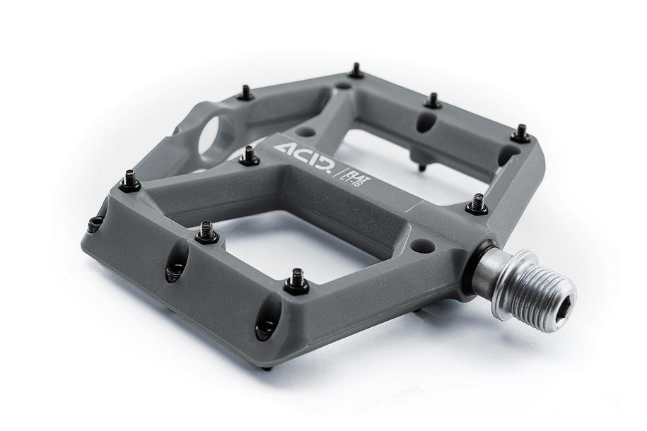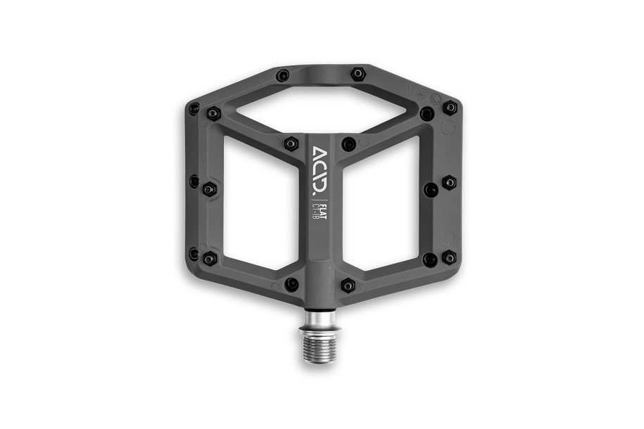 Високопроизводителни платформени педали за планинско колоездене ACID Pedals FLAT C1-IB със сменяеми пинове и скосени ръбове за по-добър клирънс в завои.