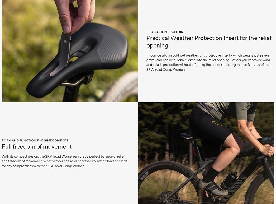 - Тъй като жените имат много по-гъвкав таз от мъжете и могат да се наклонят повече напред, седалката, предназначена за жени, трябва да осигурява целенасочено облекчение, така че да не се упражнява натиск върху чувствителната генитална област при каране на allroad и gravel. SR Allroad Women облекчава натиска и болката, благодарение на разположения напред канал и Y-образните странични крила на седалката, които насочват натиска върху поддържащата седалищна кост.