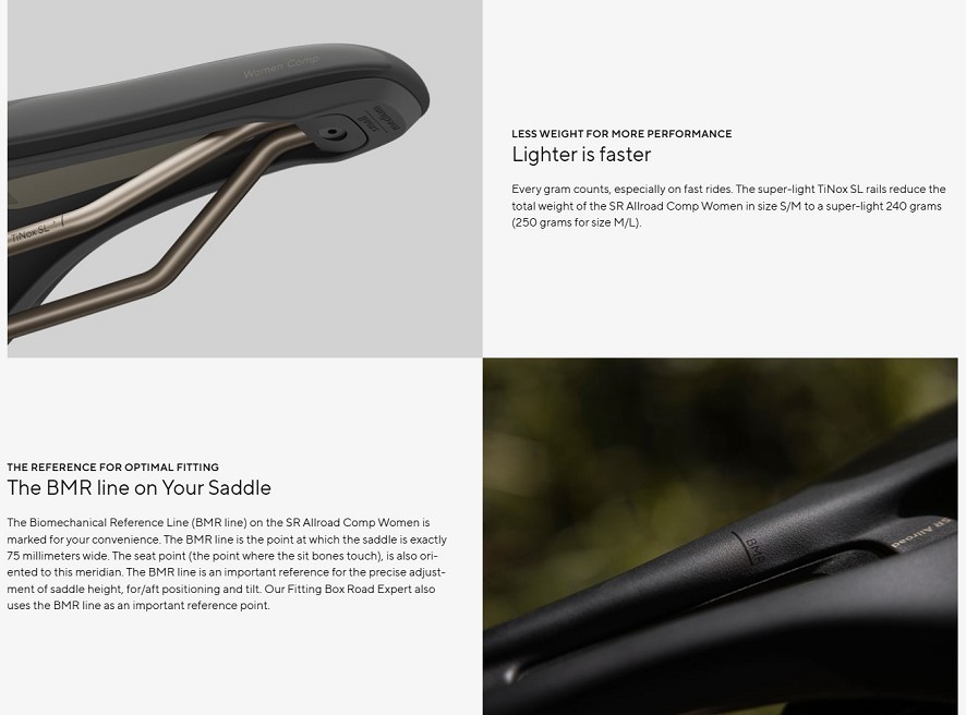 - Всеки грам е от значение, особено при бързи карания. Свръхлеките TiNox SL релси намаляват общото тегло на SR Allroad Comp Women в размер S/M до свръхлеките 240 грама (250 грама за размер M/L).